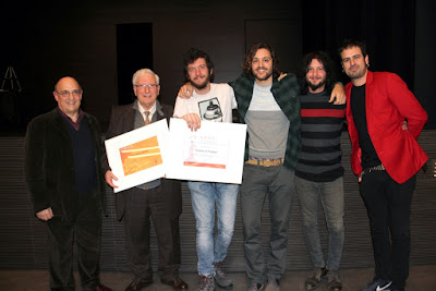 | El presidente del CPAC, Francesc Llobet, Josep M. Queraltó y los ganadores del corto "Fiction in Fiction" |
